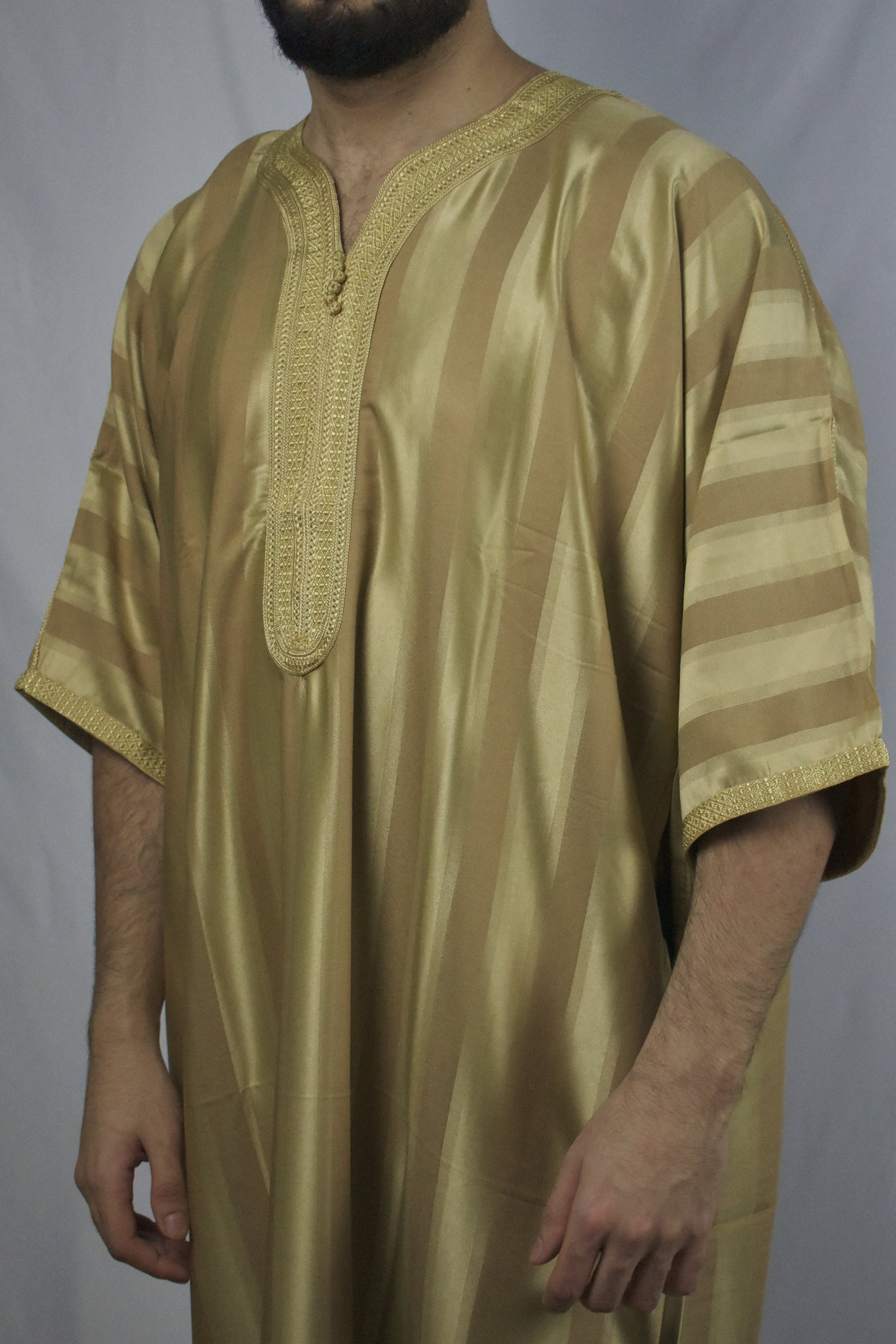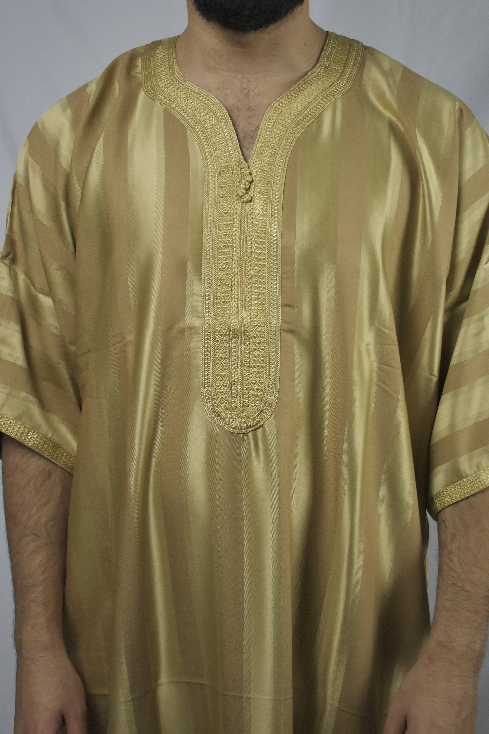 A royally Silky Golden Moroccan Thobe, embodying traditional Islamic modesty and Moroccan craftsmanship. Expertly handcrafted in Morocco, this silky thobe ensures full 'Awrah coverage, reaching a comfortable shin length in harmony with the prophetic tradition. Perfect for Jum'a prayers, 'Eid celebrations, or daily wear.