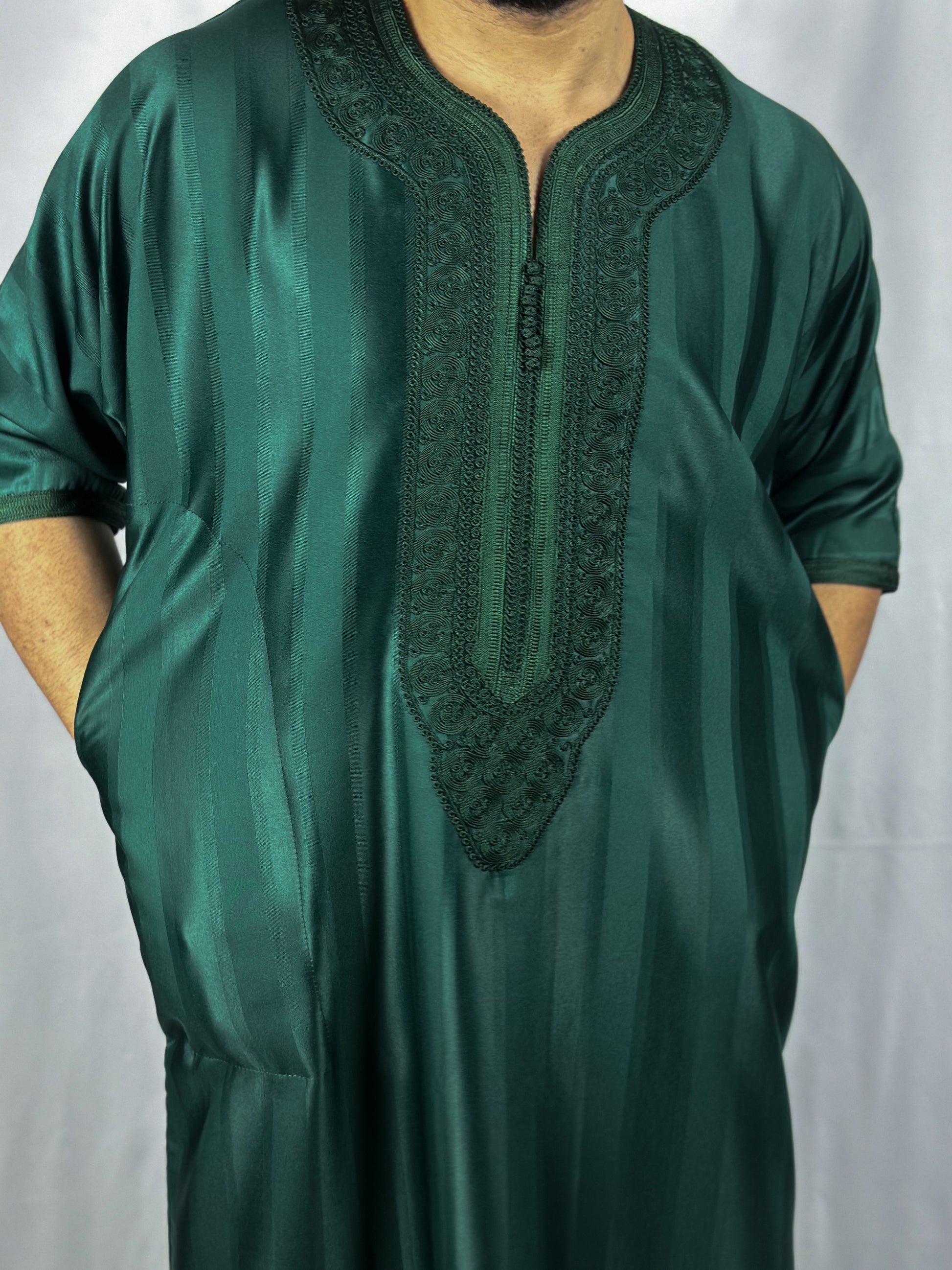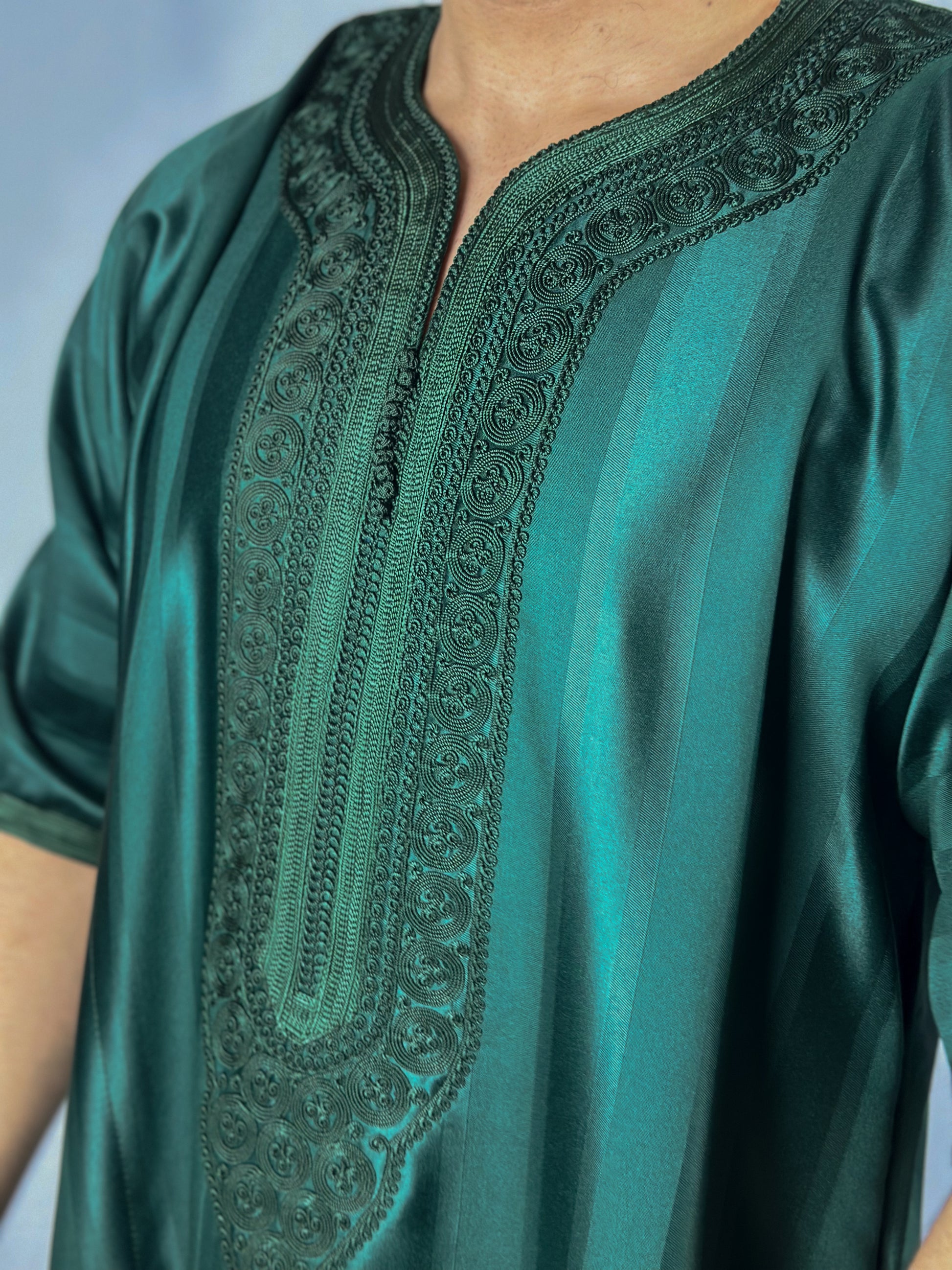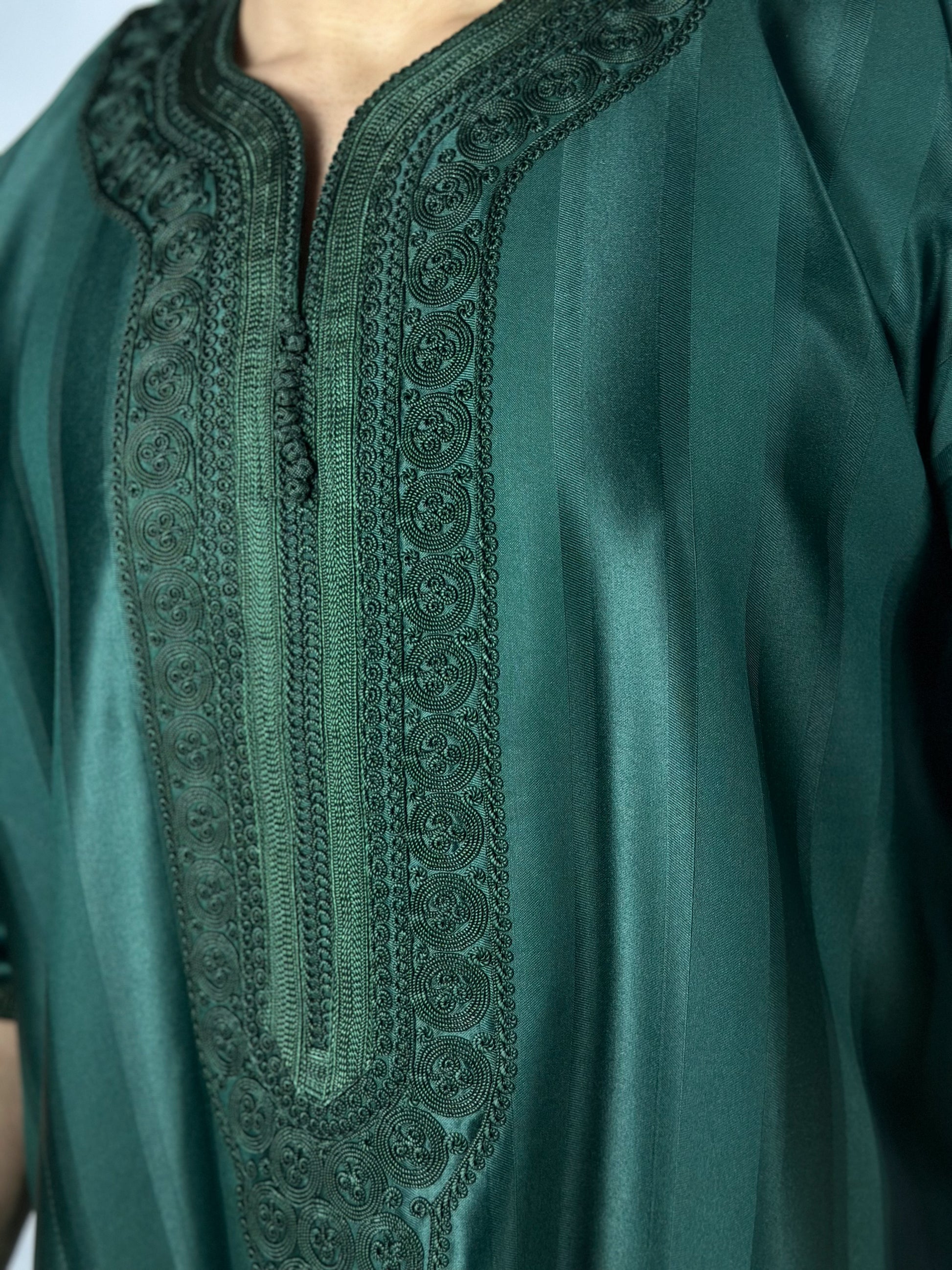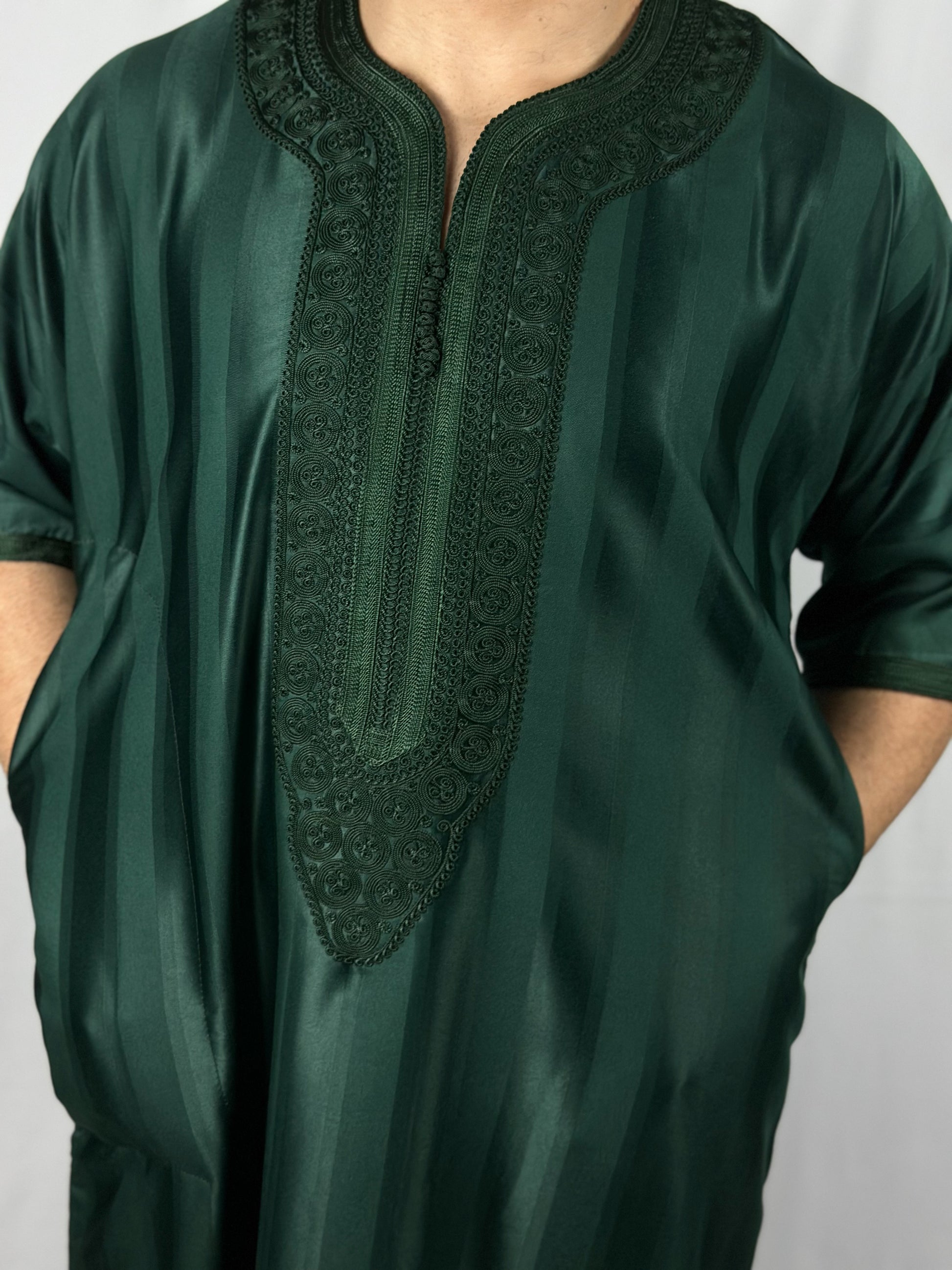 The Jungle Thobe, elegance embodied in a green satin fabric. Carefully handcrafted in Morocco with detailed stitching, this thobe ensures full 'Awrah coverage, reaching a graceful shin length in line with the prophetic tradition. Ideal for Jum'a prayers, 'Eid festivities, or sophisticated daily wear, it embodies a luxurious union of style, tradition, and devotion for the discerning Muslim wardrobe.