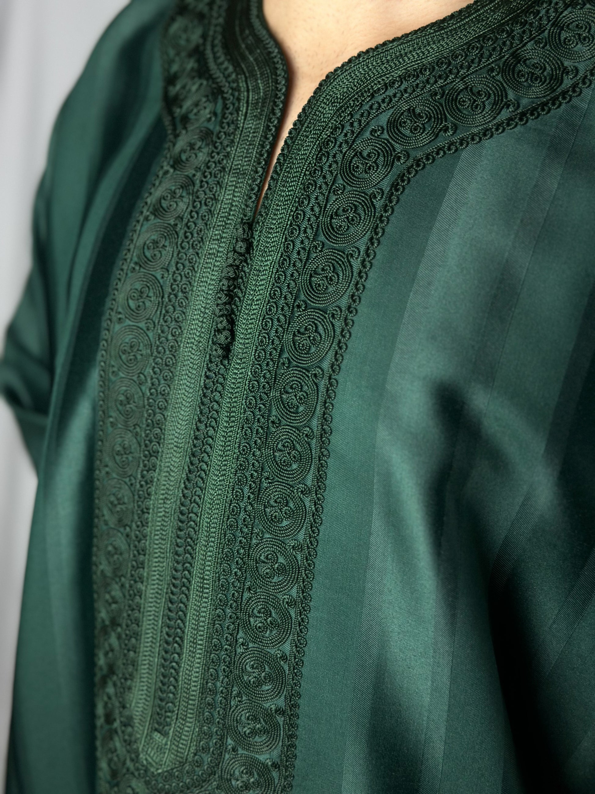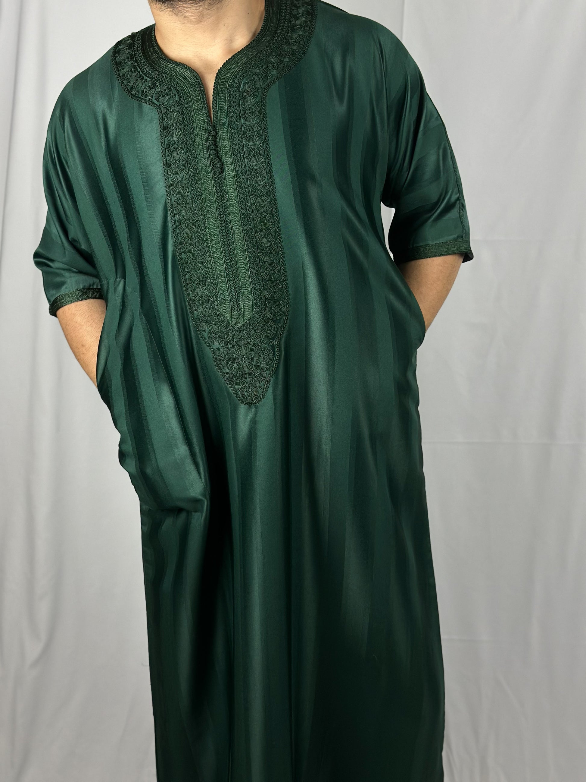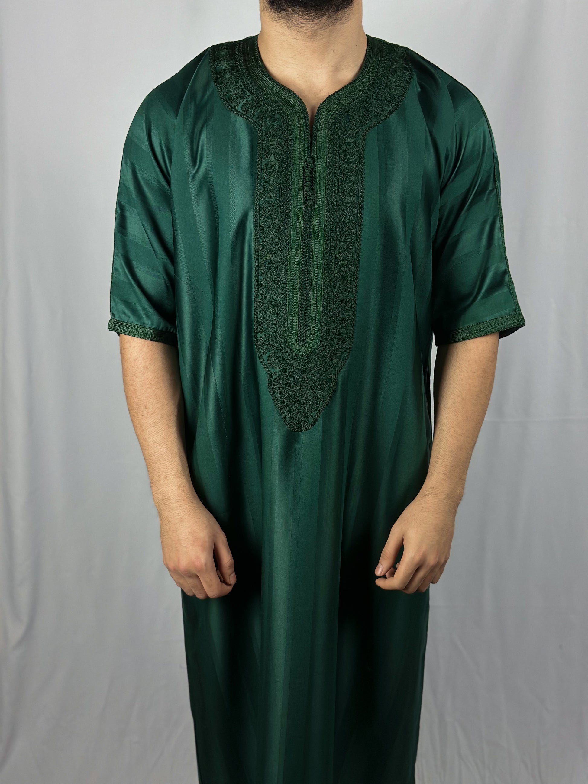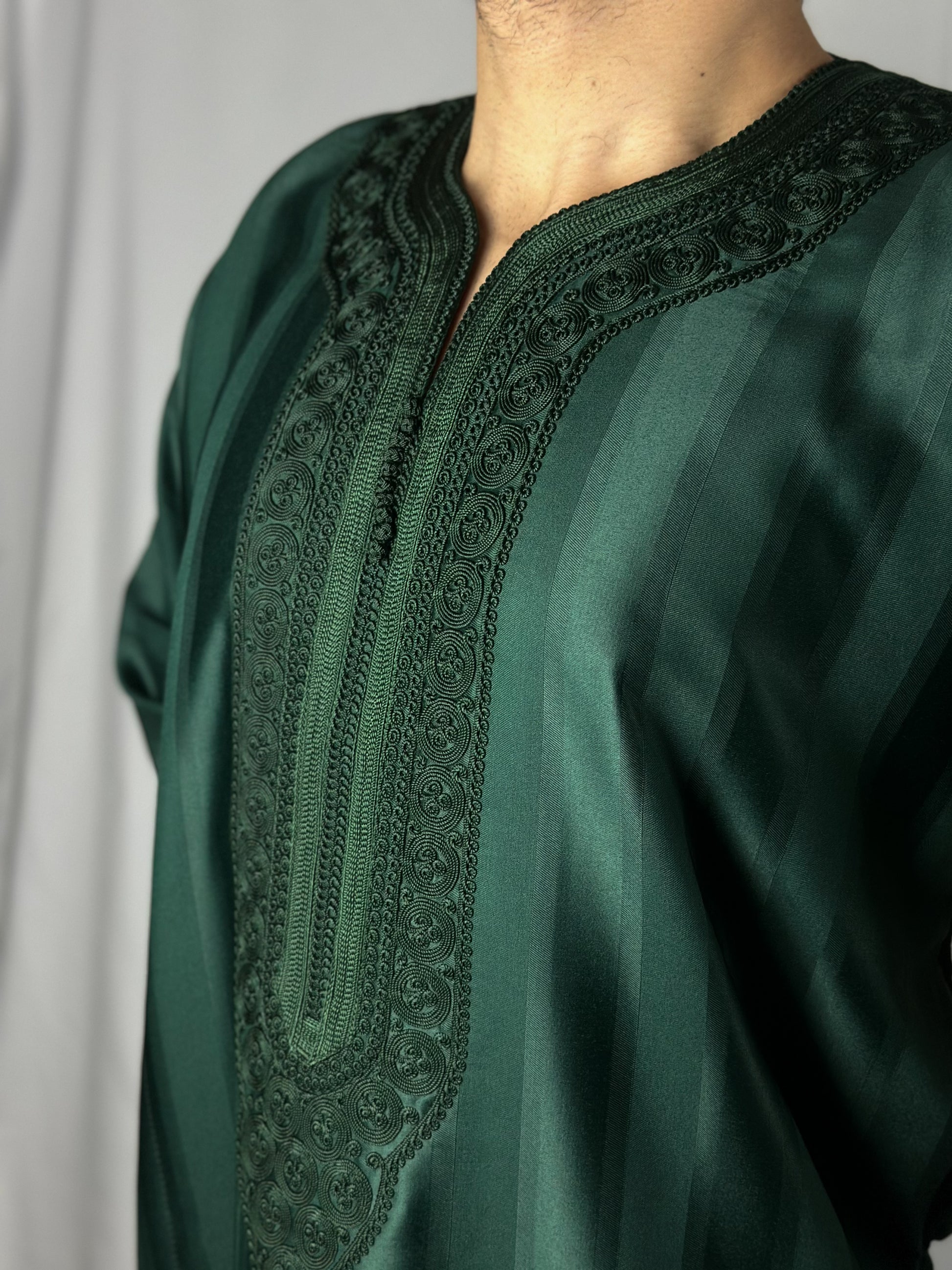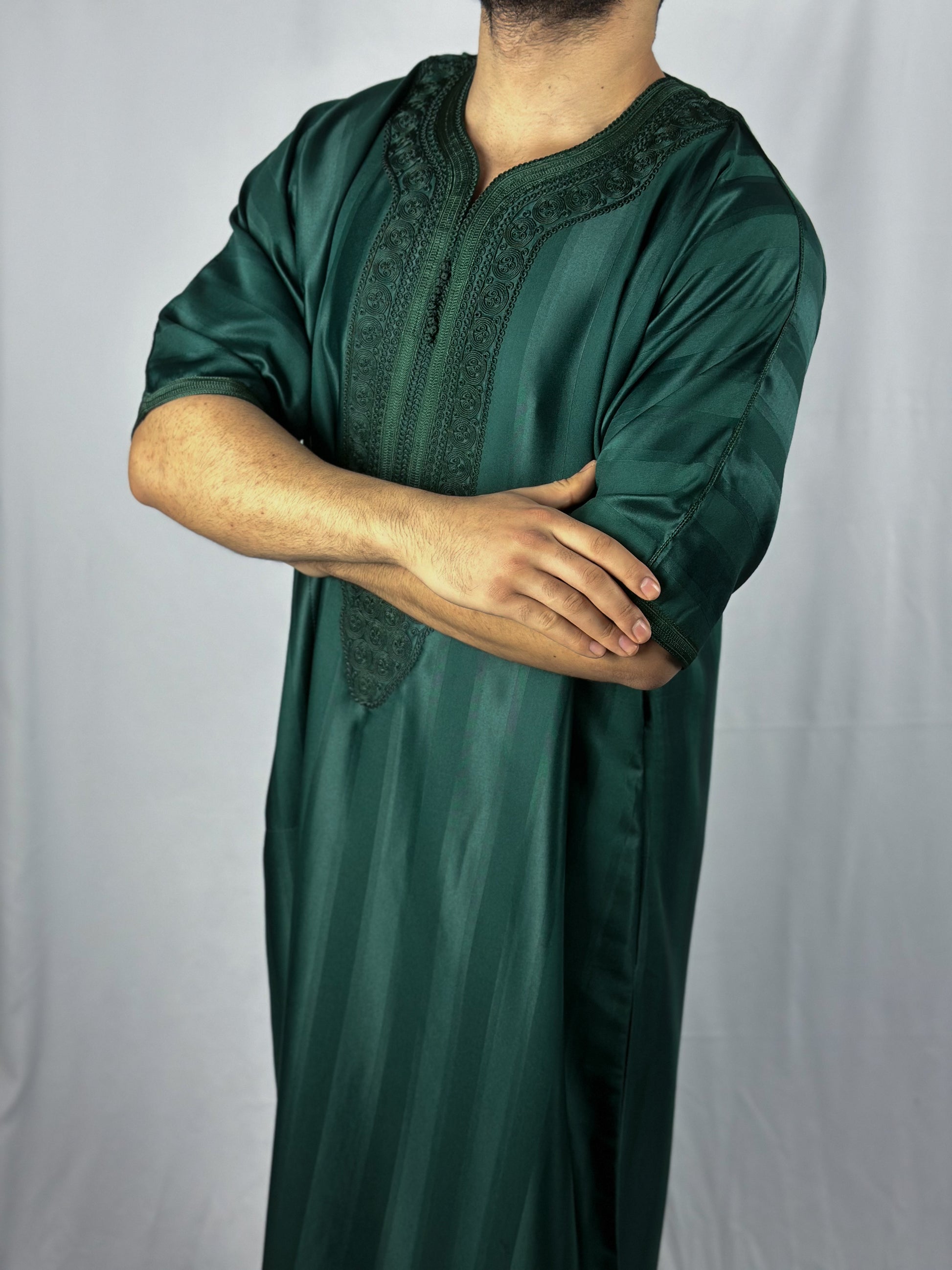 The Jungle Thobe, elegance embodied in a green satin fabric. Carefully handcrafted in Morocco with detailed stitching, this thobe ensures full 'Awrah coverage, reaching a graceful shin length in line with the prophetic tradition. Ideal for Jum'a prayers, 'Eid festivities, or sophisticated daily wear, it embodies a luxurious union of style, tradition, and devotion for the discerning Muslim wardrobe.